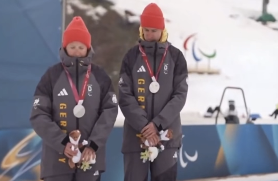 当现场响起俄罗斯国歌、升起俄罗斯国旗的时候,争议一幕发生了:德国选手和其向导在领奖台上始终低着头,且侧身面对俄罗斯国旗,以此来表达抗议。